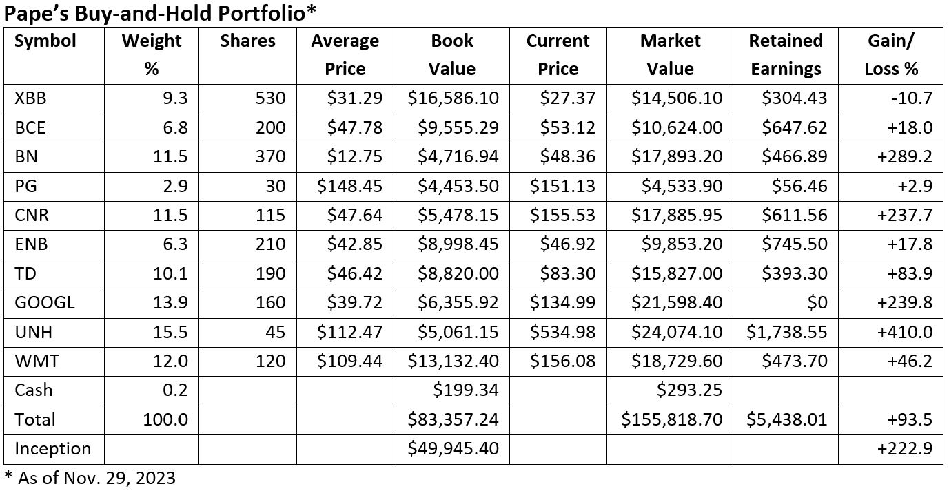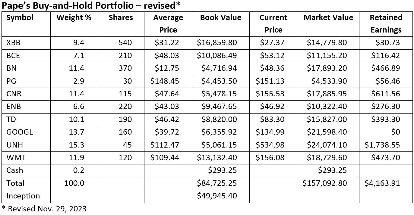 Here is the status of the portfolio as of Nov. 29. The Canadian and U.S. dollars are shown at par, but obviously the U.S. holdings are doing better thanks to the strength of the greenback. Trading commissions are not factored in, although in a buy-and-hold portfolio they are not significant in any event.