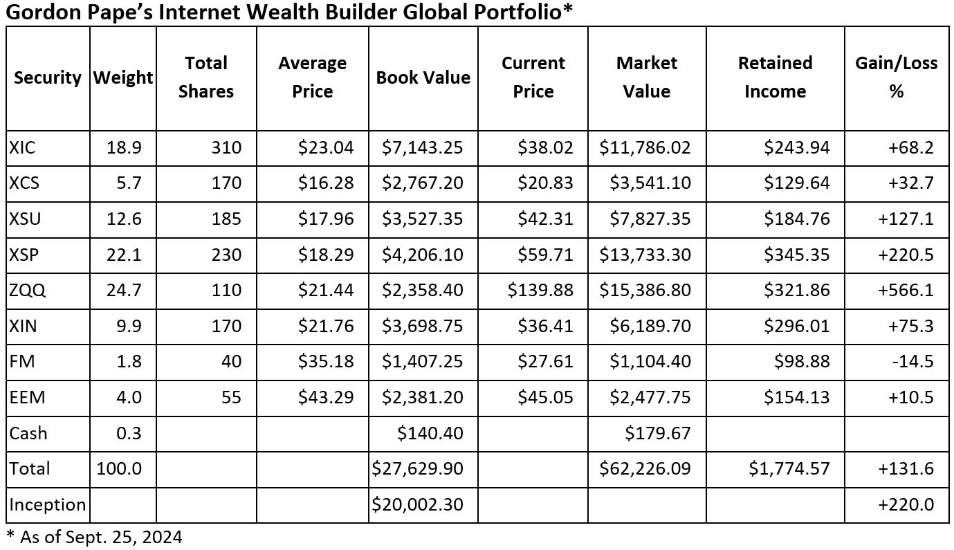 It’s a good time to be in the stock market. Not only are the major North American indexes hitting new records, but foreign exchanges, with the exception of China, are also doing well. So it should come as no surprise that my Internet Wealth Builder Global Portfolio is churning out decent gains.