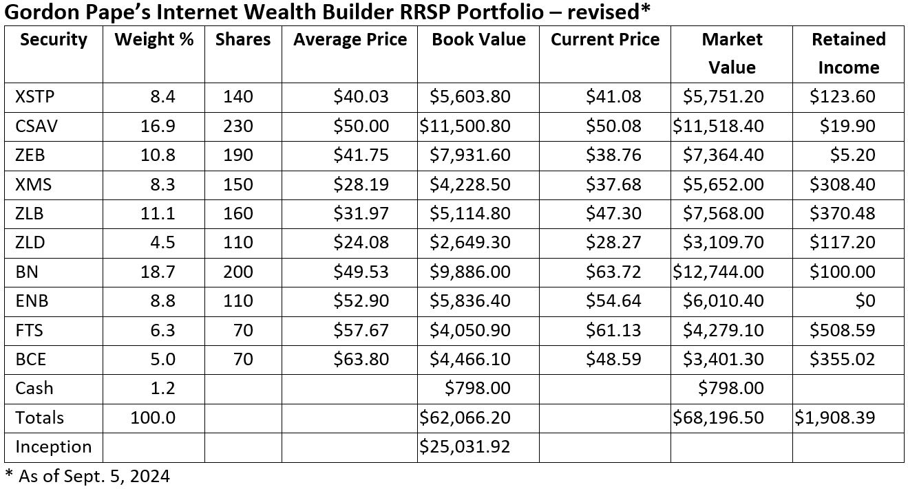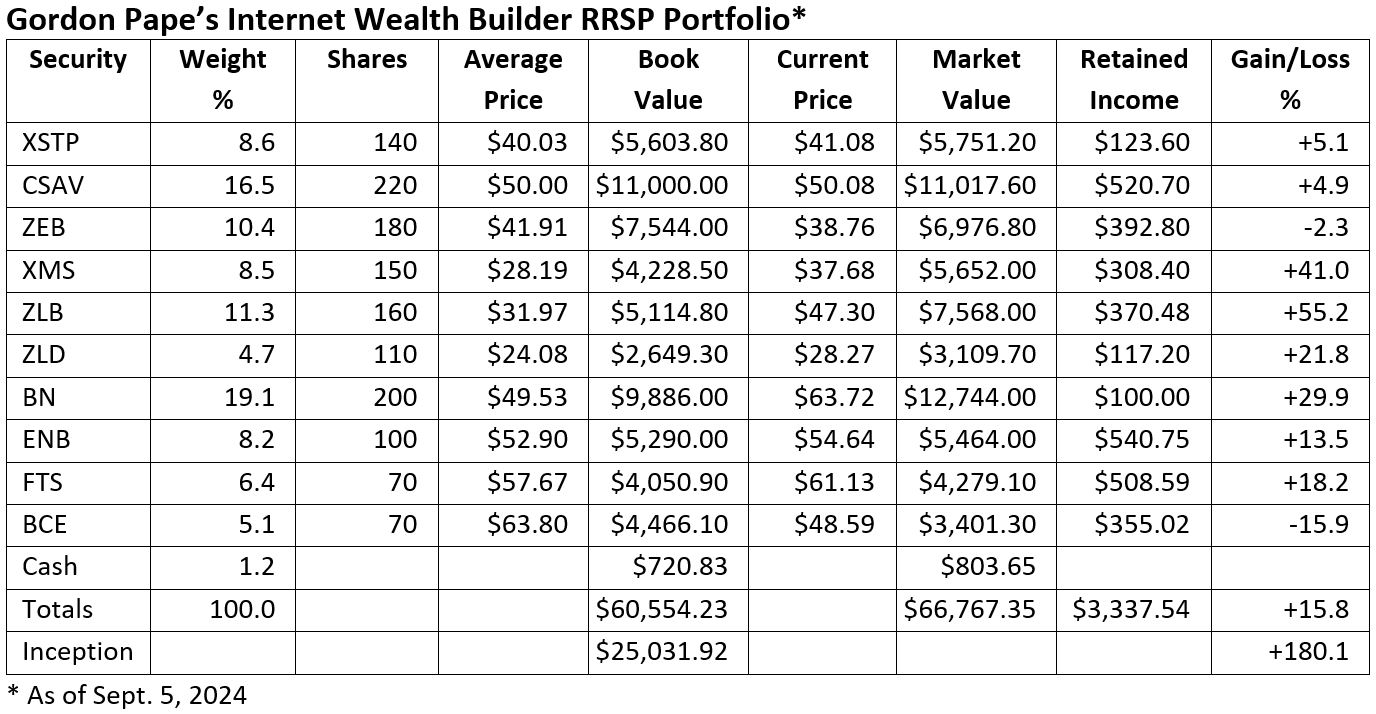 Here is how the RRSP Portfolio stood as of Sept. 5. Commissions have not been factored in. All amounts are in Canadian dollars.
