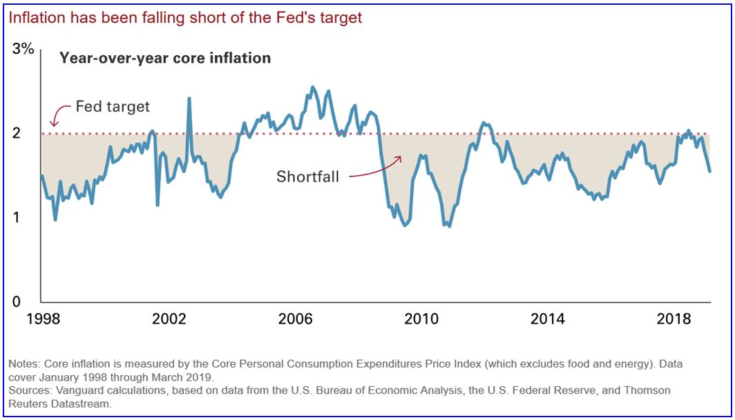 Vanguard expects the U.S. inflation rate to remain subdued over the next 10 years, with core inflation hovering around the Federal Reserve’s 2% target. Modest inflation should help boost economic growth, as interest rates are likely to remain low.