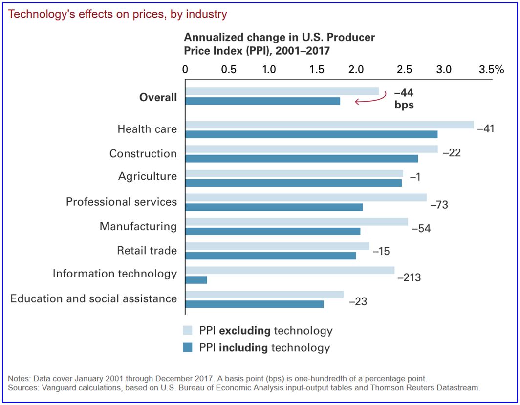 Our research suggests that declining input prices for computers and electronic products, computer design and services, and other technology inputs trimmed almost 0.5 percentage point per year from production costs from 2001 through 2017 and ultimately from wholesale prices. Without Moore’s Law, annualized U.S. inflation would have been almost 0.5 percentage point higher. Without technology’s price-suppressing effects, core inflation would be at 2% or more, achieving the Federal Reserve’s inflation target. The higher inflation that would have resulted would have forced the Fed to further raise interest rates.
