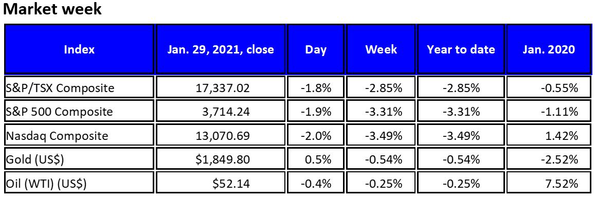Stocks markets closed Friday with losses on the week, after elevated volatility in a handful of small stocks led to a bout of selling. The volatility appeared to have been induced initially by a short squeeze on shares of video-game retailer Gamestop Corp. (NASDAQ: GME), which had been heavily shorted by a number of large hedge funds. The move appears to have been inspired by a message board on social media channel Reddit. Smaller retail investors seem to have banded together to buy shares of Gamestop using trading app Robinhood, boosting share price by 400% during the week. The strategy spread to some other heavily-shorted issues, causing further short-covering and attendant market volatility.