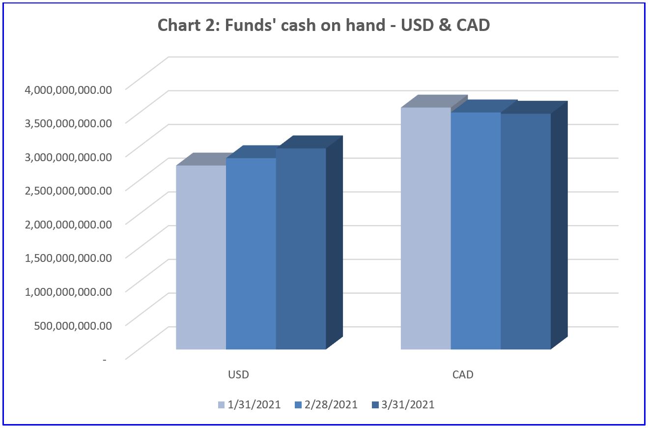 Chart 2 illustrates the mean cash dollar value in sequential order from January 2021 to March 2021. The United States dollar had a net position of $2,980,526,008 for March 2021. The Canadian dollar had a net position of $3,494,234,164 for March 2021.