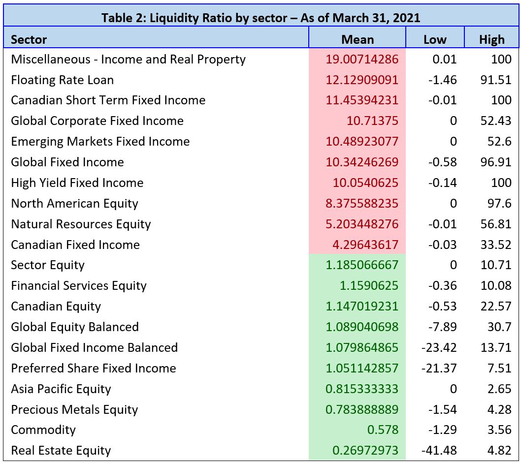 The Investment Fund Liquidity Ratio is calculated as the amount of cash in a fund relative to its total assets. It is important to assess this ratio when analyzing investments and allocating capital. It has the power to give deep insight into the overall flow of capital into specific verticals and the bullish or bearish sentiment in these investment categories. Table 2 lists the top and bottom 10 out of applicable sectors based on the mean ratio of over 3,000 investment funds with a mandate to invest in the corresponding sectors. The table lists the most bearish to most bullish sectors in descending order.