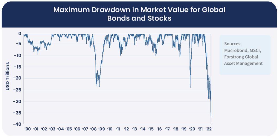 All very cheery stuff. And markets have taken note. Wealth destruction in 2022 has been eye-watering. Never mind the complete carnage in crypto (the last spasm of a speculative mania), the wipeout in SPACs (why did we allow profitless companies with no coherent business plans to come to market?), or even the wreckage in lockdown favorites like Netflix and Zoom. The declines this year in a plain-vanilla balanced portfolio have been record-setting: An equally split global stock and bond index has seen the largest ever loss in value, easily outdoing the declines of the 2008-09 financial crisis and the 2020 pandemic.