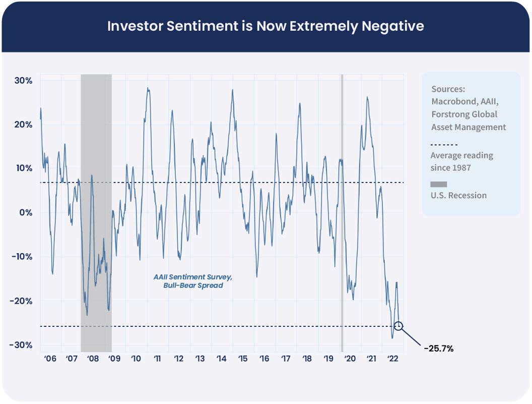 Why should we be discussing a new bull market when the outlook seems so bleak? The best answer is that levels of investor sentiment are now consistent with past bottoming processes. Markets do not form tops when investor sentiment is universally pessimistic. Rather tops occur with everyone predicting ever-sunnier skies ahead and partying like it’s 1999. Markets fully discount that view and upside surprises become much more difficult to deliver. By contrast, bull markets are born out of pessimism.