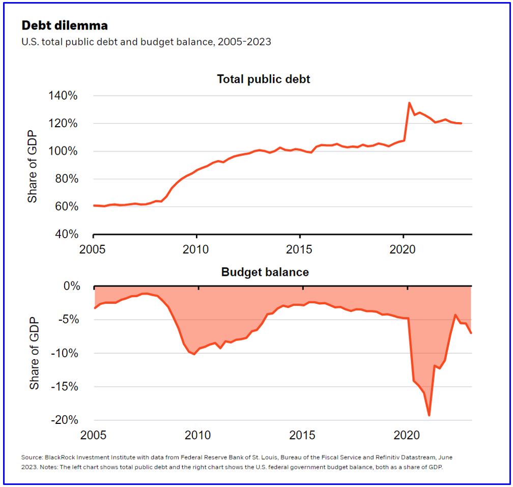 The recent U.S. debt-ceiling deal removes near-term uncertainty and thrusts the market’s focus back to the macro picture: sticky inflation due to tight labor markets. We see rates staying higher for longer as a result. We keep a quality tilt in portfolios and prefer income for now. Over time, we could see the attention shifting to the large U.S. debt load – and investors demanding more compensation for holding long-term government bonds.