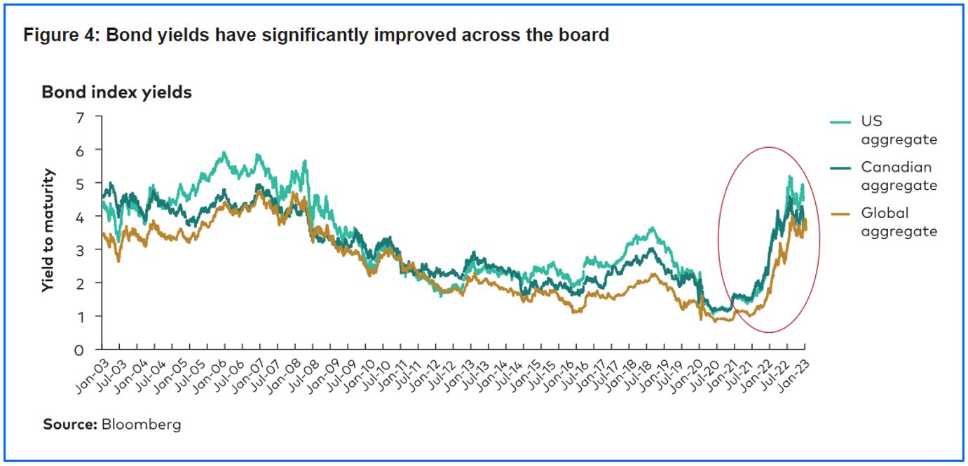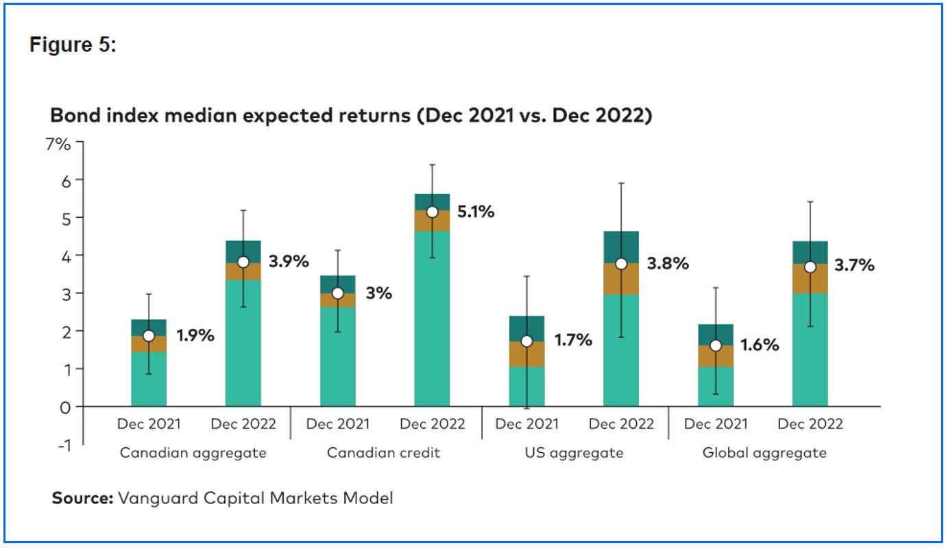 At the end of December 2022, we anticipated that the median 10-year return for Canadian bonds will range from 3.4% to 4.4%, around a 2% per annum increase from our forecast at year-end in 2021. Likewise, for global aggregate bonds (ex-Canada, hedged), we now anticipate median 10-year returns of 3.2% to 4.2%, over 2% per annum improvement since the last year.