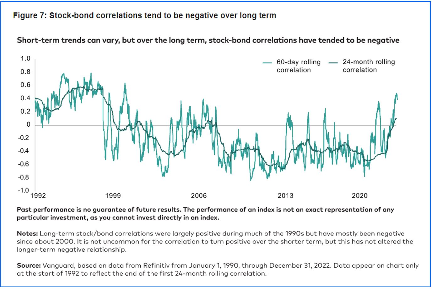 As shown in figure 7, during much of the 1990s, stock-bond correlations were largely positive and have spiked into positive territory on numerous occasions since then. Correlations over the longer term, however, have remained negative since around the year 2000, and we expect this pattern to continue.