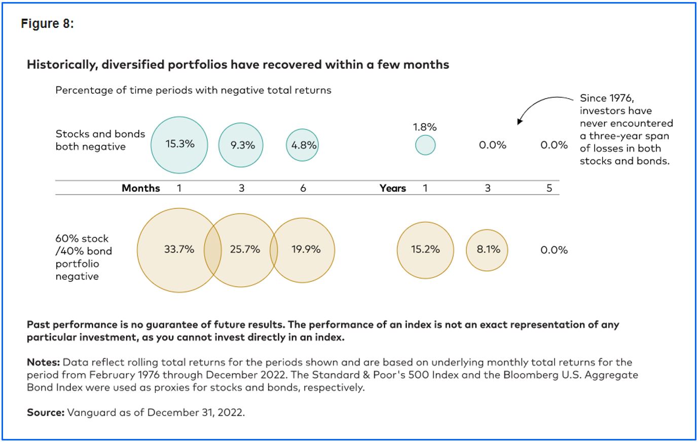 Moreover, our research, based on data from 1976 to 2022, shows that the time periods when both stocks and bonds have experienced negative performance get shorter as the observation period extends. Figure 7 shows stocks and bonds have both experienced negative performance in the same month 15.3% of the time, over the same three-month period 9.3% of the time, and over the same six-month period 4.8% of the time. But these two asset classes have both experienced negative total returns over one-year periods only 1.8% of the time. And since 1976, investors have never experienced a three- or five-year period during which both stocks and bonds sustained losses.