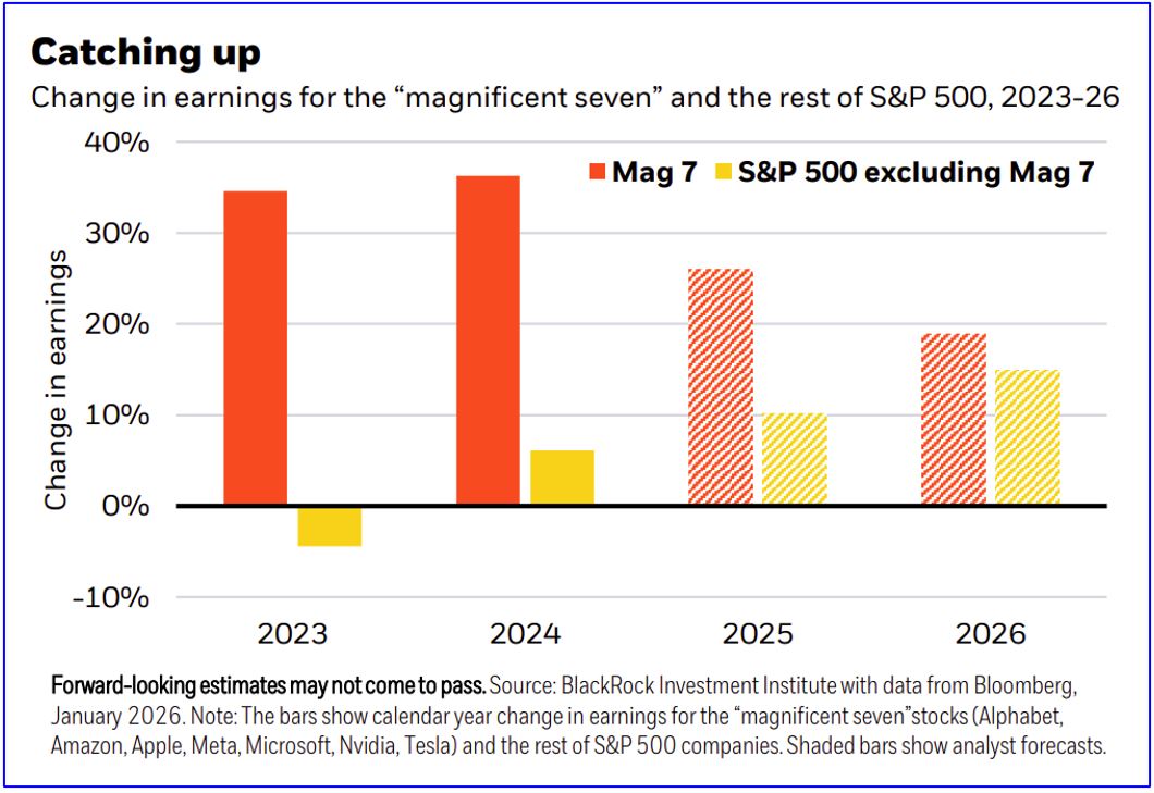 We still prefer tech broadly as earnings growth looks healthy and poised to broaden, both within the U.S. and globally. S&P earnings and profit margins have also proved more resilient to tariffs than many investors expected. Consensus expectations for the magnificent seven have been revised upward to show 20% earnings growth in the fourth quarter versus a year ago and then holding up at 19% in 2026, according to Bloomberg data. That compares with 6% for the other S&P 493 in the fourth-quarter and 15% in 2026.