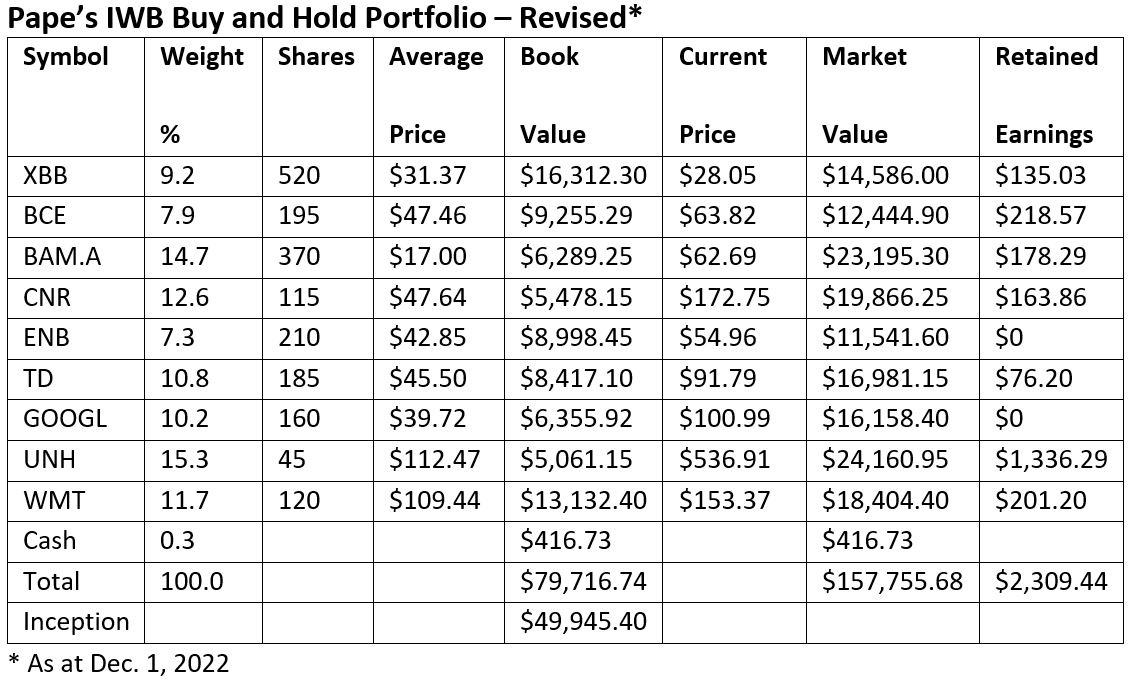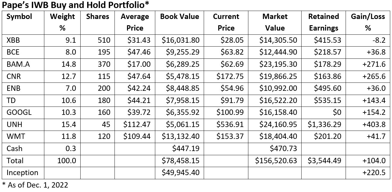 Here is the status of the portfolio as of Dec. 1. The Canadian and U.S. dollars are shown at par, but obviously the U.S. holdings are doing better thanks to the strength of the greenback. Trading commissions are not factored in, although in a buy and hold portfolio they are not significant in any event.