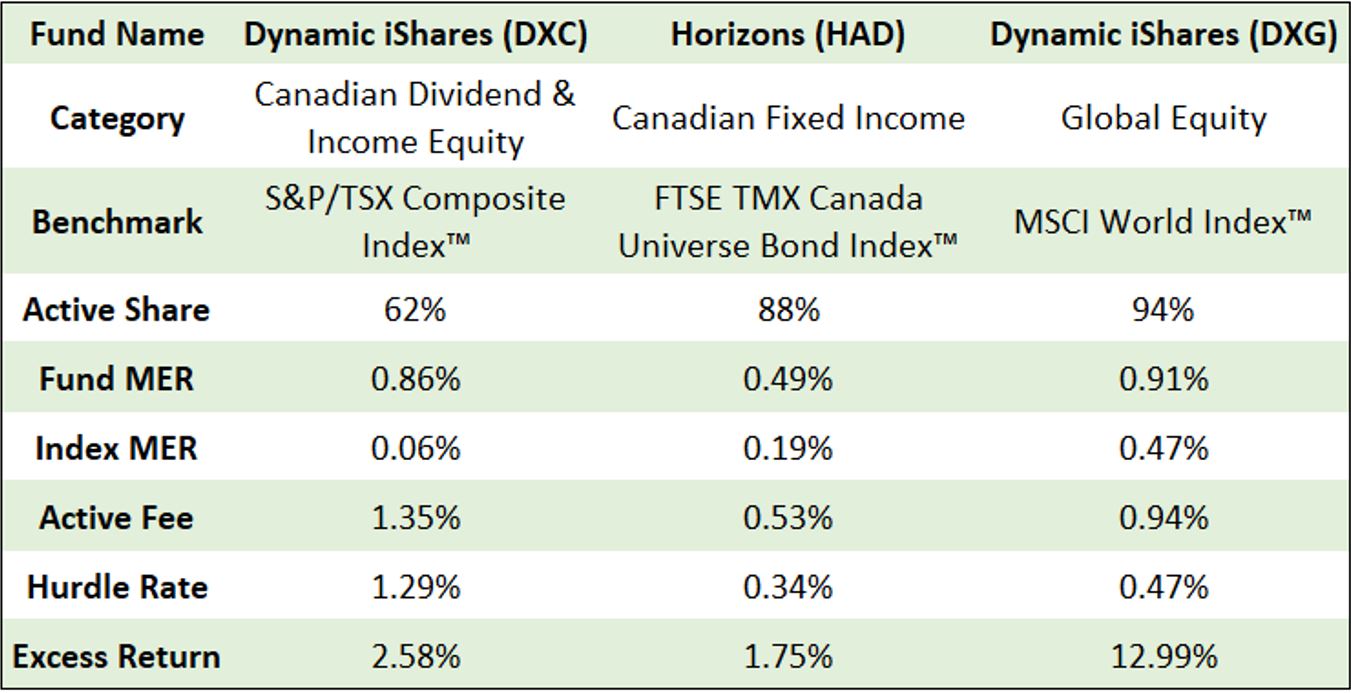 Dynamic iShares Active Global Dividend ETF (TSX: DXG) is noteworthy in particular, as it sails over its Hurdle Rate with a blistering one-year return of 29%, an Excess Return of 13 percentage points over its benchmark. It achieves this return through skillful stock selection, specifically focusing on large-cap companies with growing yields. The fund actually targets a high Active Share in order to differentiate the portfolio from its benchmark and lists that as one of the main reasons to invest. At an extremely high 94%, the calculated Active Share validates the claim. While that alone does not imply better performance, it does show that the manager knows what it takes to deliver truly valuable active management.