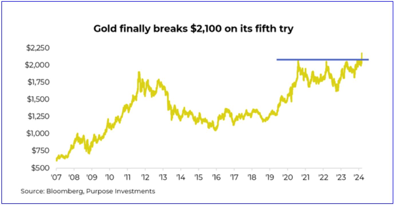 Fast forward to the present: a strong U.S. dollar, higher real yields than we have seen in a long time, investors continuing to pull money out of gold ETFs, inflation continuing to come down, yet the price of bullion has reached a new all-time high. Breaking through a resistance level that had proven impenetrable on four previous occasions dating back to 2020. Welcome to the world of gold.