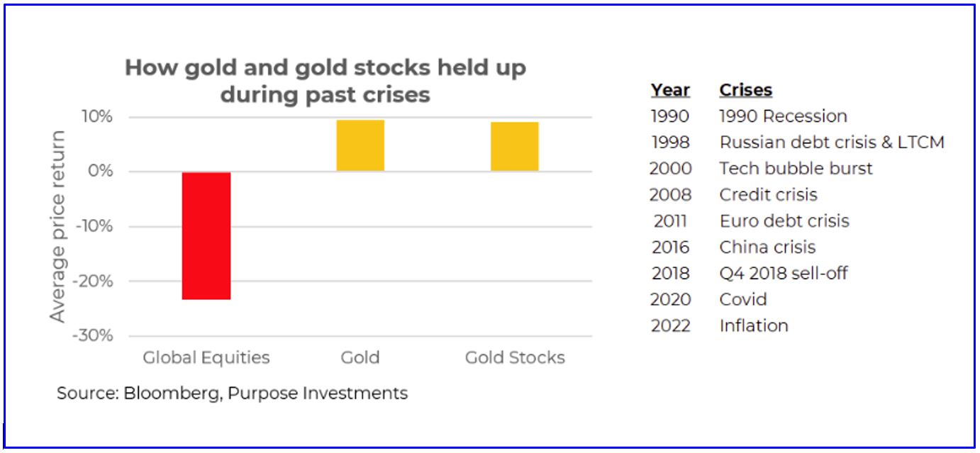 Crisis Alpha. You can’t buy home insurance when your house is already on fire. Yet gold often sees strong inflows after a crisis has surfaced. The last period of inflows to gold ETFs was during the scare over U.S. regional bank bankruptcies. The price of bullion and gold stocks have a long history of doing well during periods of crisis. It is during these kinds of crises that diversification becomes hard to find, which remains a great characteristic for some gold exposure in a portfolio.