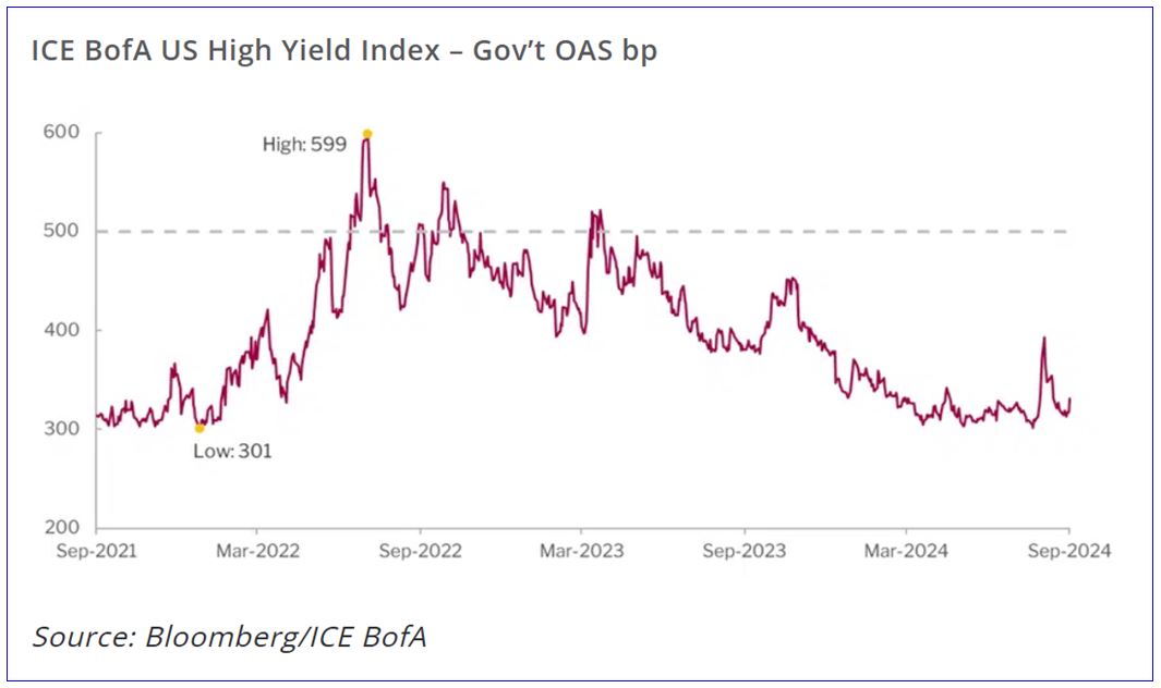 There is usually a negative correlation between government bond yields and spreads, as all-in yields attract buyers with absolute return targets, causing spreads to compress as base rates rise. Also, generally macro developments, which are positive for Treasuries, are often negative for risk assets and risk premiums. This has not been the case recently as the market appears to believe that weaker economic data is positive for risk assets because it creates the ability for the Federal Reserve to lower rates. The concept of “goldilocks,” or economic fundaments that are “just right,” tends not to hold historically.