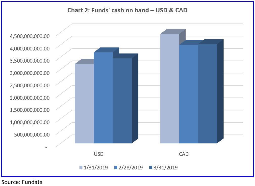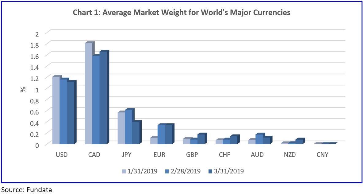 Chart 1 illustrates the mean cash percentage in Canadian investment funds for nine major currencies in sequential order from January 2019 to March 2019. The U.S. dollar posted a 3.7% decline month-over-month decline for the period ended March 31, 2019, while the Canadian dollar gained 5.1%. Similarly, the Japanese yen (JPY) lost 35.2%, the euro (EUR) broke even, the British pound (GBP) gained 110.2%, the Swiss franc (CHF) advanced 72.6%, the Australian dollar (AUD) dropped 32%, the New Zealand dollar (NZD) gained 378.3%, and the Chinese yuan (CNY) was flat.