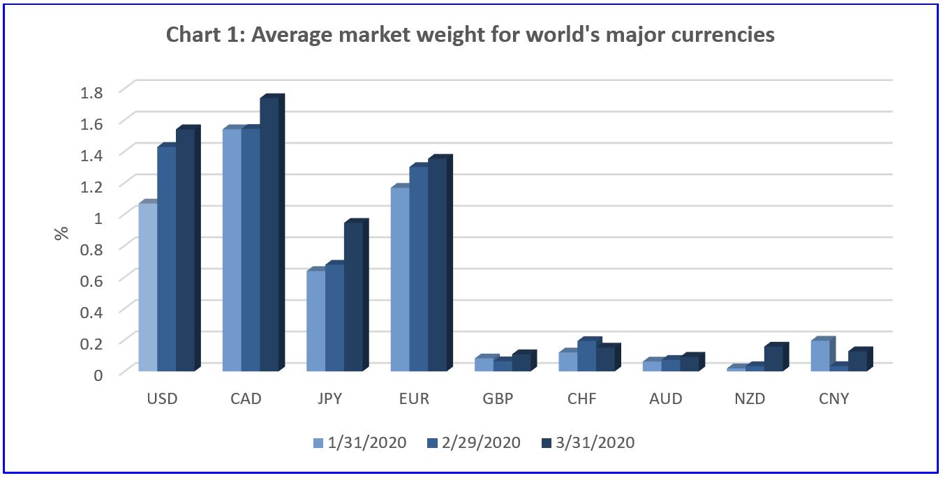 Chart 1 illustrates the mean cash percentage in investment funds for nine major currencies in sequential order from January 2020 to March 2020.