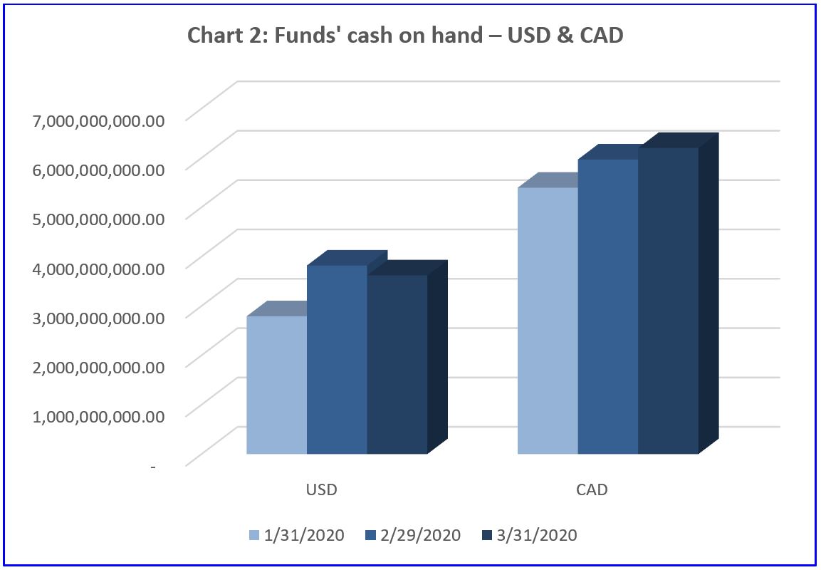 Our analysis focuses on the Canadian investment fund industry in the first quarter of 2020, and how portfolio managers are allocating capital in major currencies. The currency analysis excludes all cash equivalents, such as bonds with less than one year to maturity and collateral cash held to fulfill debt covenants. We believe by excluding these items, we can home in on the deployable cash in investment funds and assess the street’s market sentiment. We then further analyze the liquidity of investment funds on the basis of cash and cash equivalents, categorized by sector, to help us understand which verticals portfolio managers are currently overweighting and underweighting.
