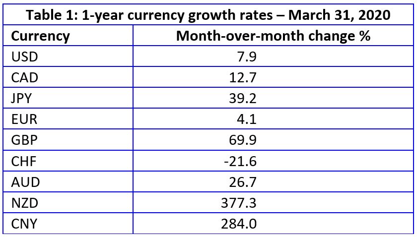 Table 1 illustrates the month-over-month growth rates for the world’s major currencies.