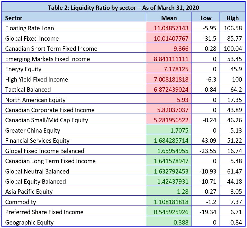 The Investment Fund Liquidity Ratio is calculated as the amount of cash in a fund relative to its total assets. It is important to assess this ratio when analyzing investments and allocating capital. The ratio has the power to shed light on the overall flow of capital into specific verticals and the bullish or bearish sentiment in these investment categories. Table 2 shows the top and bottom 10 funds out of applicable sectors based on the mean ratio of over 3,000 investment funds with a mandate to invest in the corresponding sectors. Table 2 lists the most bearish to most bullish sectors in descending order.