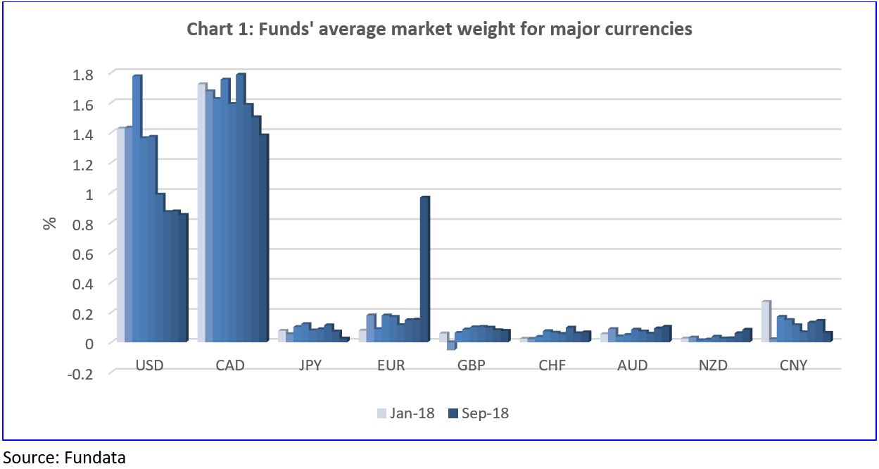 Chart 1 illustrates the mean cash percentage in Canadian investment funds for nine major currencies in sequential order from January 2018 to September 2018. The U.S. dollar posted a 2.7% month-over-month decline for the period ended Sept. 30, 2018, while the Canadian dollar lost 8.1%. Similarly, the Japanese yen (JPY) lost 65.1%, the euro (EUR) gained 538.3%, the British pound (GBP) dropped 5.3%, the Swiss franc (CHF) gained 10.0%, the Australian dollar (AUD) rose 11.7%, the New Zealand dollar (NZD) advanced 37.5%, and the Chinese yuan (CNY) fell 55.7%.
