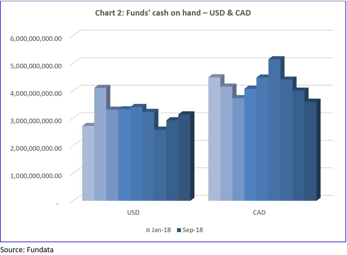 Chart 2 illustrates that managers took U.S. dollar profits from capital markets in February 2018. This served as an indicator of the ensuing downturn of American and Canadian markets that began during February and continued to the end of March. From Chart 1, you will notice U.S. dollar cash peaked in March 2018, from which American indices have been on a rally to the end of September 2018. The steady decrease in cash from this point onwards helps us understand the positive market sentiment and the bullish outlook portfolio managers had from this time moving forward.