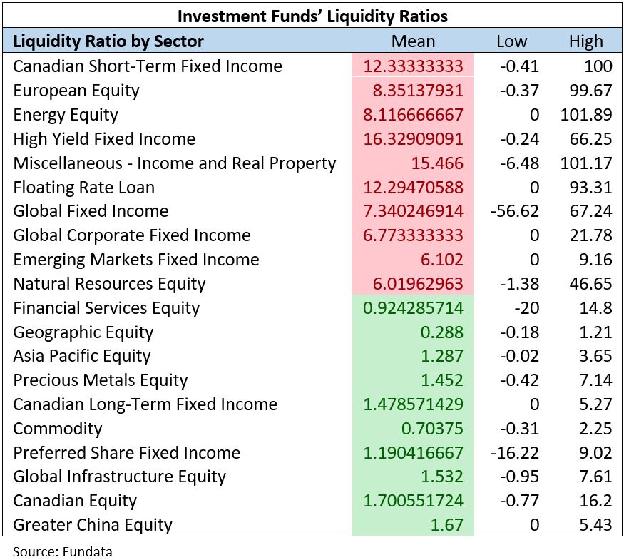 The Investment Fund Liquidity Ratio is calculated as the amount of cash in a fund relative to its total assets. It is important to assess this ratio when analyzing investments and allocating capital. It has the power to give incredible insight into the overall flow of capital into specific verticals and the bullish or bearish sentiment in these investment categories. The accompanying table lists the top and bottom 10 out of 54 applicable sectors based on the mean ratio of over 3,000 investment funds with the mandate to invest in the corresponding sectors.