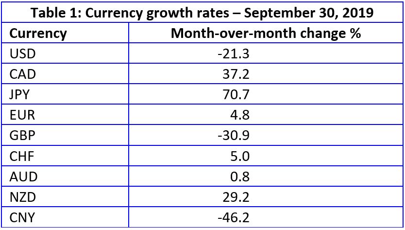 Table 1 illustrates the month-over-month growth rates for the world’s major currencies.