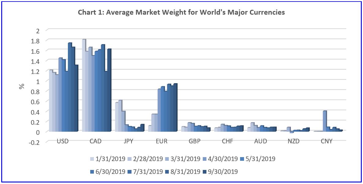 In Asia, Japan continues to face economic uncertainty as it fails to open up to foreign investors, and we can see managers lowering their Japanese yen-denominated holdings. The eurozone has been hit with tail winds from the U.S.-China trade war, but should recover relatively quickly. In fact, money managers have been buying euros as the currency may have entered oversold territory. The United Kingdom remains in the same situation, with a different captain, Boris Johnson. The deadline for Brexit continues to be delayed, and the nation has now been asked to decide the issue with a general election. Investment managers have consequently been lowering their Sterling-denominated holdings as the currency may be in for a rude awakening if the country continues to fail on its promises.