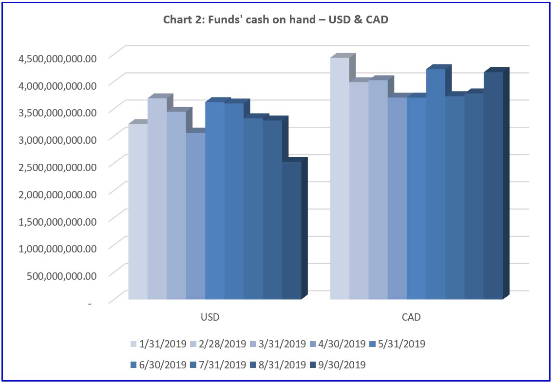 The Chart 2 illustrates the mean cash dollar value in sequential order from January 2019 to September 2019. The United States dollar had a net position of $2,524,801,071 for September 2019. The Canadian dollar had a net position of $4,170,585,188 for September 2019.