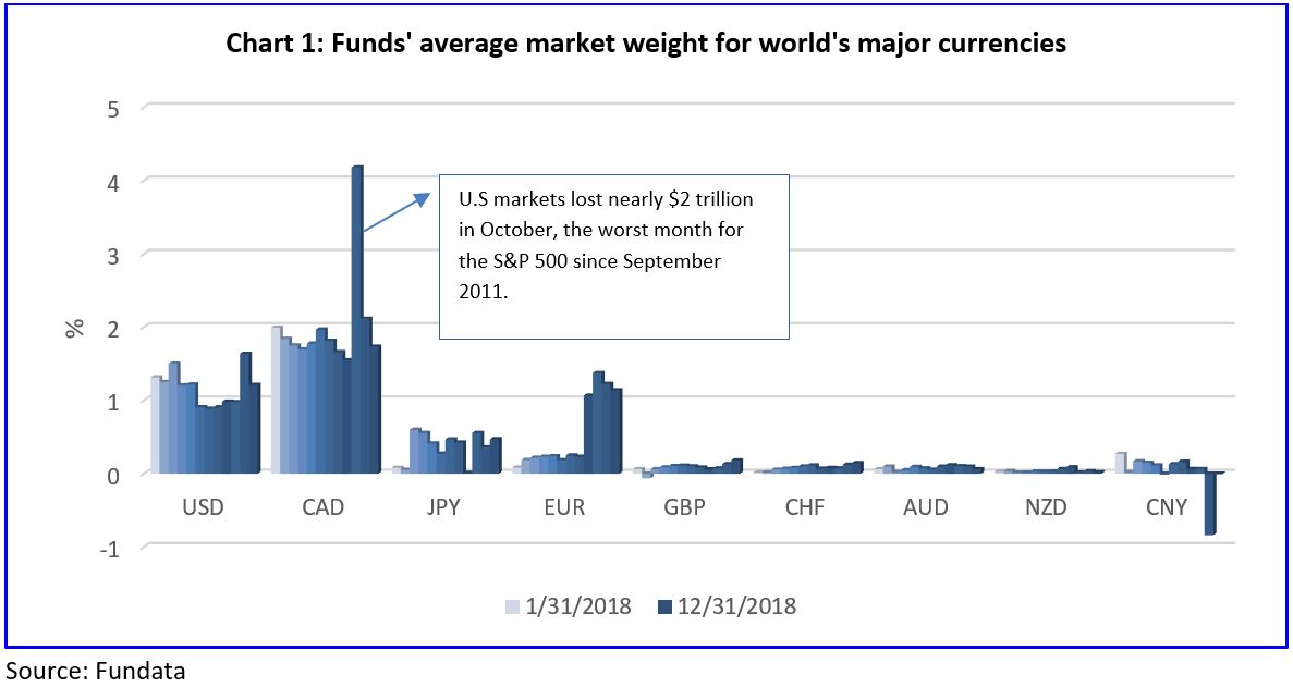 Chart 1 illustrates the mean cash percentage in Canadian investment funds for nine major currencies in sequential order from January 2018 to December 2018. The U.S. dollar posted a 25.9% decline month-over-month decline for the period ended Dec. 31, 2018, while the Canadian dollar lost 18.0%. Similarly, the Japanese yen (JPY) gained 31.7%, the euro (EUR) lost 7.0%, the British pound (GBP) gained 38.9%, the Swiss franc (CHF) dropped 18.0%, the Australian dollar (AUD) dropped 35.6%, the New Zealand dollar (NZD) dropped 37.4%, and the Chinese yuan (CNY) fell 99.1%.