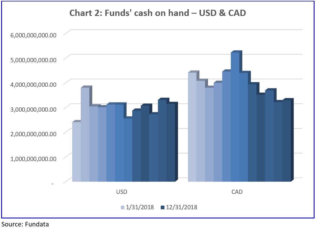 Capital markets were in a world of pain towards the end of 2018, giving back almost all the gains earned earlier in the year. The market downturn began in early October and continued to the end of December. Taking a look at Chart 1, we see a significant spike in Canadian cash for month end October 2018. In Chart 2 we notice a modest increase in from September to October.