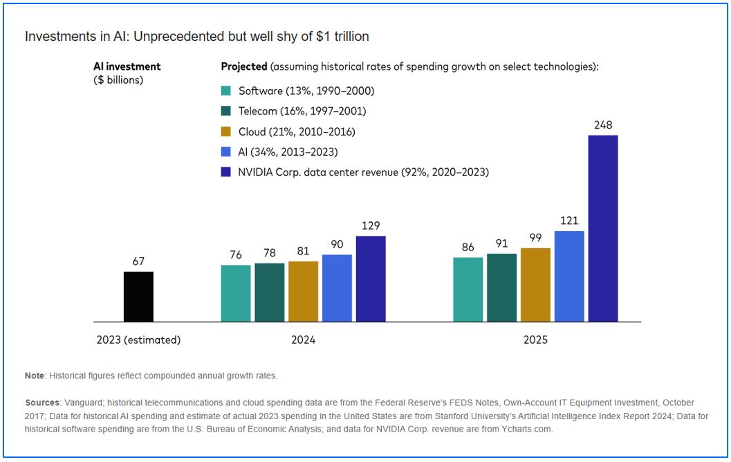 As shown in the above chart, last year, U.S. investments in AI totaled an estimated $67 billion. To project such spending in the near term, we grossed up last year’s investments in AI by various annualized rates of growth ranging from 13% to 34%. Those hypothetical growth rates reflect the rate of growth in AI investments over the last decade as well as the rates of investment in three other broad technologies in their heydays. Those rates of growth would leave AI spending this year and next in the $76 billion to $121 billion range.