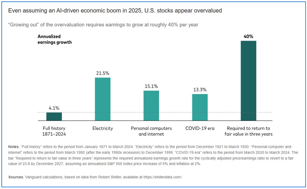With profit margins close to record highs, most of a hypothetical 40% annualized profits jump would have to come from soaring corporate revenues. But slowing economic growth precludes soaring sales. My team’s forecast of U.S. economic growth in 2025 is 1%-1.5%, which would be down from our expectations of 2% growth this year.