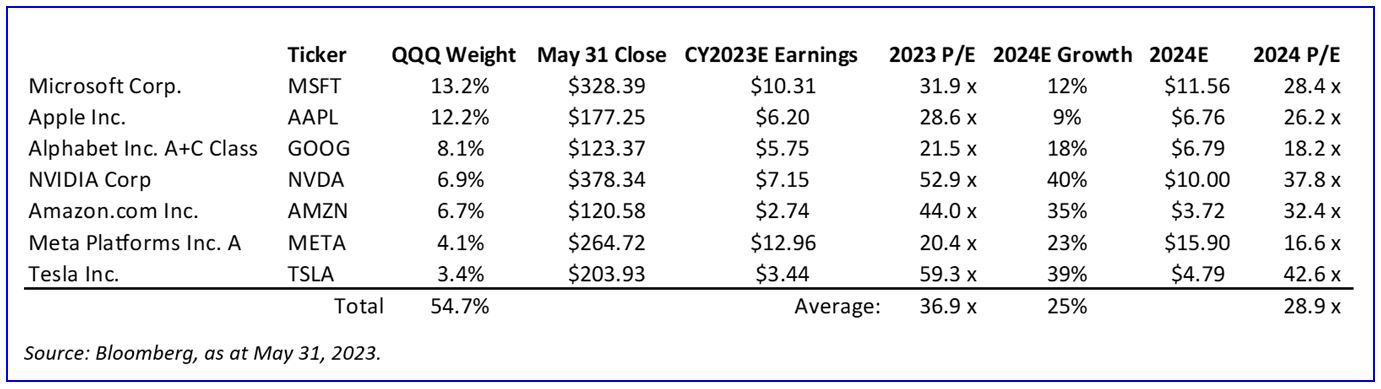 We find it hard to square the valuation of mega-cap technology stocks with what we believe is an appropriate discount rate. Looking at month-end prices relative to Bloomberg consensus 2023 calendar year-adjusted EPS estimates, the seven largest components of the Invesco QQQ Trust Series 1 (NSD: QQQ) trade at an average P/E multiple of 36.9x, with expected EPS growth of 25% in 2024, decelerating significantly thereafter.