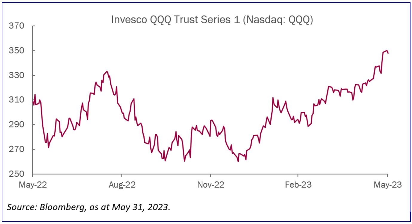 May was an eventful month for markets. Incoming economic data implied that interest rates are likely to stay higher for longer, which weighed on fixed income markets. Large-cap equities were unfazed by higher discount rates and plowed higher, driven by enthusiasm about the potential of artificial intelligence (AI). An increasingly narrow set of market leaders is not healthy for the market, but investor psychology and fear of missing out (FOMO) might continue to drive performance over the short term.