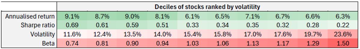 Do they actually work? Yes, says Chris Heakes, senior portfolio manager with Harvest ETFs, which is based in Oakville, Ontario. He noted a recent study prepared by BNP Paribas that looked at the performance of U.S. equities between 2011 to 2025, which covered the period that included the Covid market drop. The table shows a striking correlation between lower volatility/lower beta stocks, and improved absolute and risk-adjusted performance outcomes.