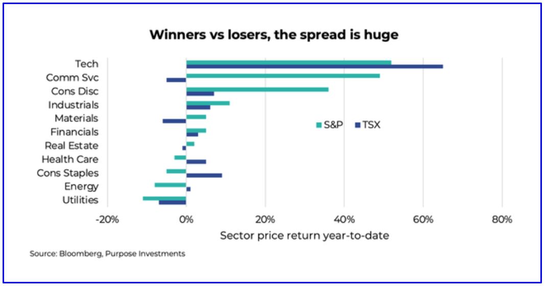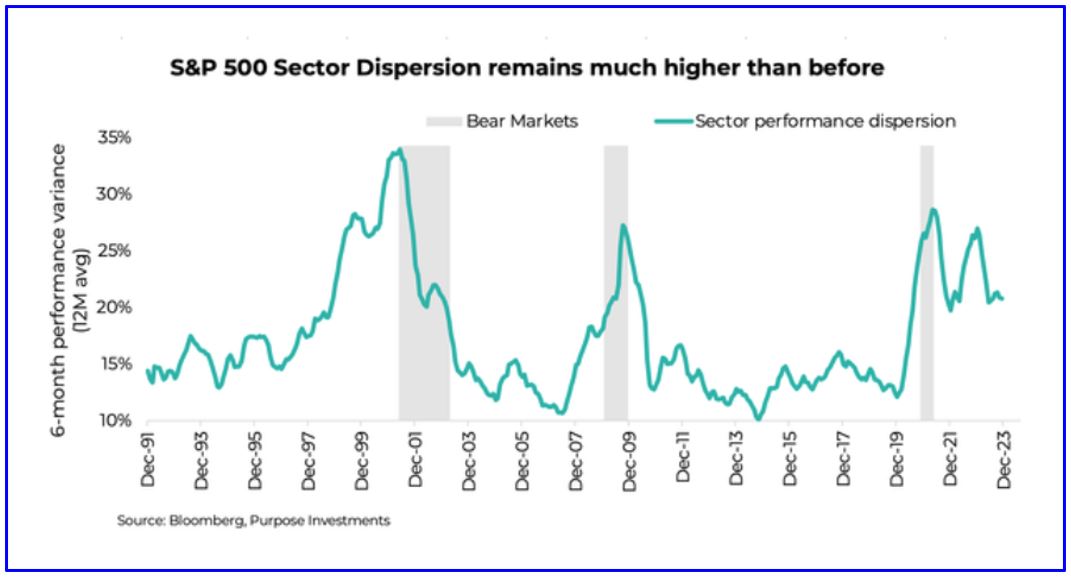 Now, you may be wondering why you should care about dispersion. It is evidence that the market is becoming more micro-driven. Company fundamentals are starting to matter more, leverage matters again, and how a company or investment can handle higher yields or inflation matters. From 2010-2020, it was more of a macro beta-driven market. Not saying the macro drivers are gone, but it would appear there is more of a balance between the macro and the micro. Just look at the dispersion in performance in 2023 among sectors for the S&P and TSX…it’s HUGE.