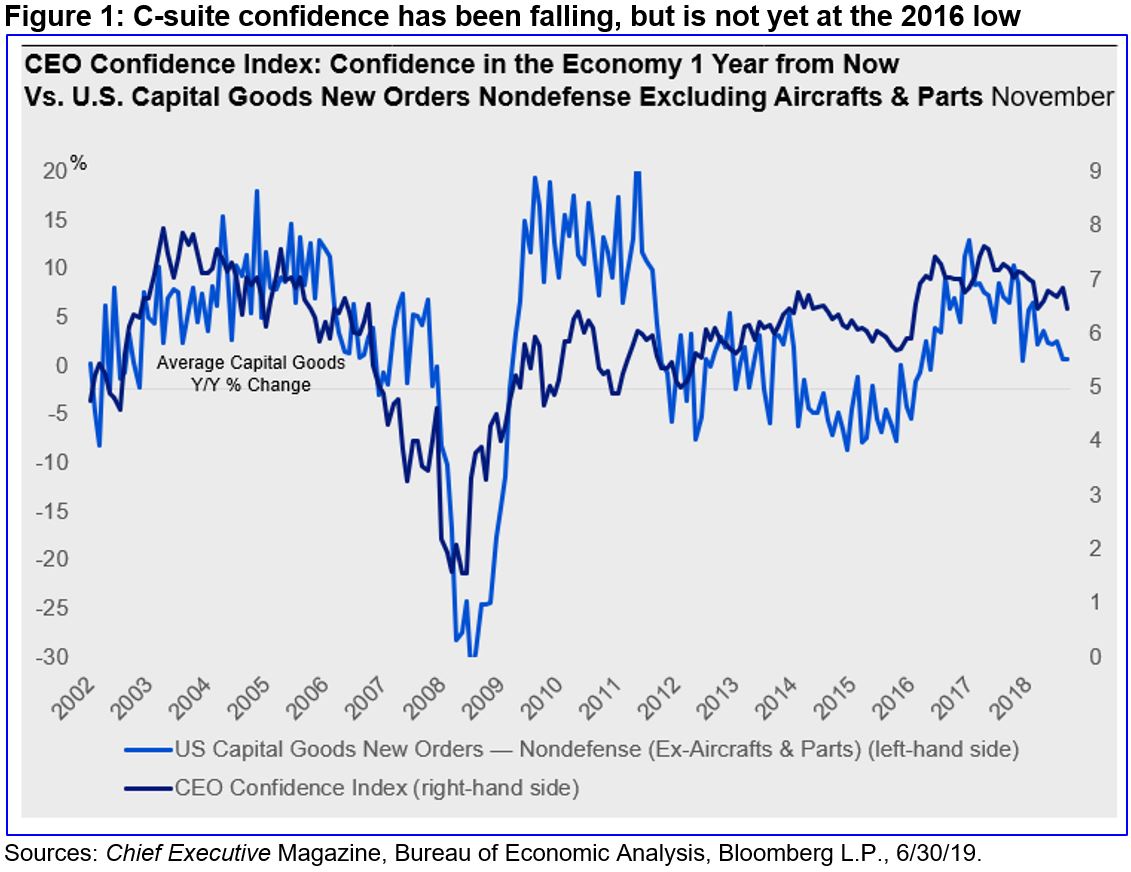 In Figure 1, we highlight the weakness in business investment growth, as represented by capital goods orders, as business confidence wavers.