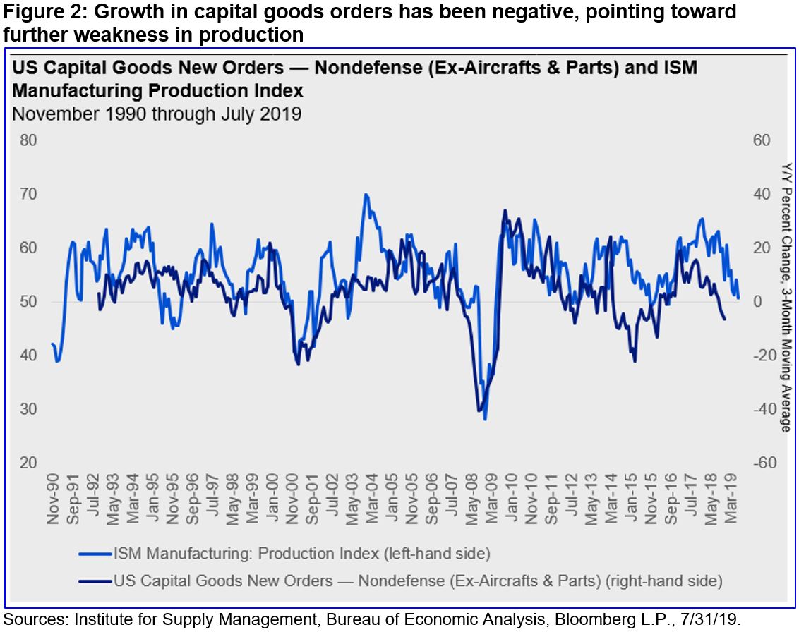 In Figure 2, we highlight the weakness in the ISM Manufacturing Production Index, a leading indicator of future economic activity (below 50 signals contraction), as capital goods orders have fallen.