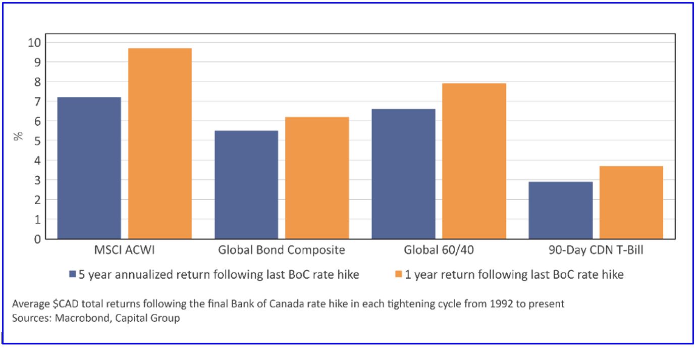 The peaking out of interest rate-hiking cycles around the world will extend the bull market that bottomed in October 2022. During the last eight rate-hiking cycles in Canada, risk assets soared after the last hike (measured over 1- and 5-year periods). Cash always underperformed.