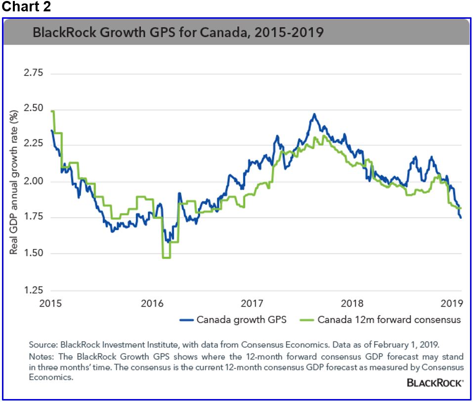 Firstly, we believe the global economy is in the midst of a late-cycle economic slowdown, and the Canadian economy is not immune to these forces. Our BlackRock Growth GPS projects the annual economic outlook for the Canadian economy will be roughly 1.75% in three months’ time, down from 2.5% in the second half of 2017 (see Chart 2).