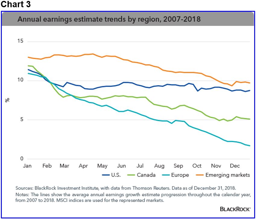 In the post-financial-crisis period, we found that earnings estimates decline in Canada by far more than in the U.S. and emerging markets on average over the course of a calendar year (see Chart 3). What is noteworthy about this period is that it coincides with the end of the commodity super-cycle and elevated uncertainty about Canadian oil production and distribution.