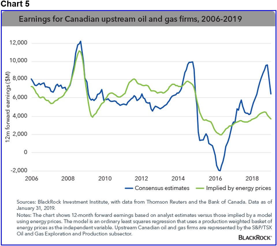 At the beginning of the year, analysts had expected just over 20% growth in energy sector earnings in Canada in 2019. That estimate has now fallen to roughly 2%. This is healthy, but there may be more to go (see Chart 5).