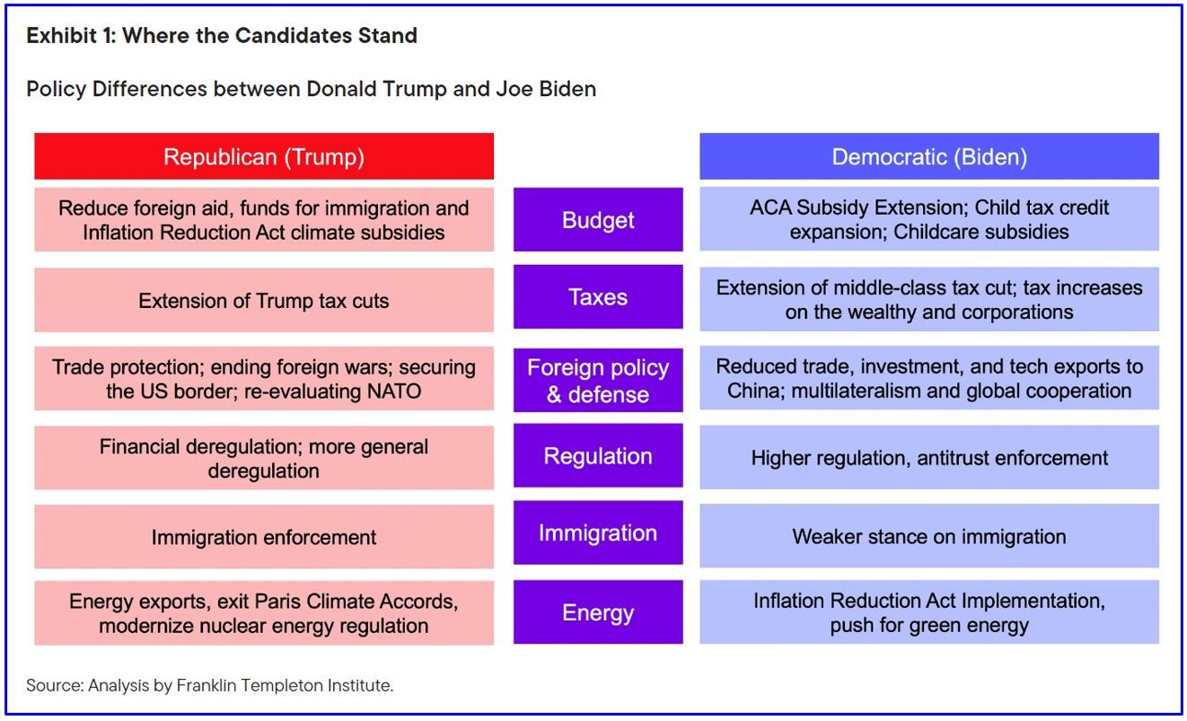 Our aim in this piece, however, is not to offer an assessment of which candidate is likely to emerge victorious, nor which party will hold a majority after the elections in the U.S. Senate or House of Representatives. Rather, our aim is to offer a summary of key policy differences the major parties offer, and to draw broad conclusions about the implications of competing policy outcomes for capital markets this year and next.