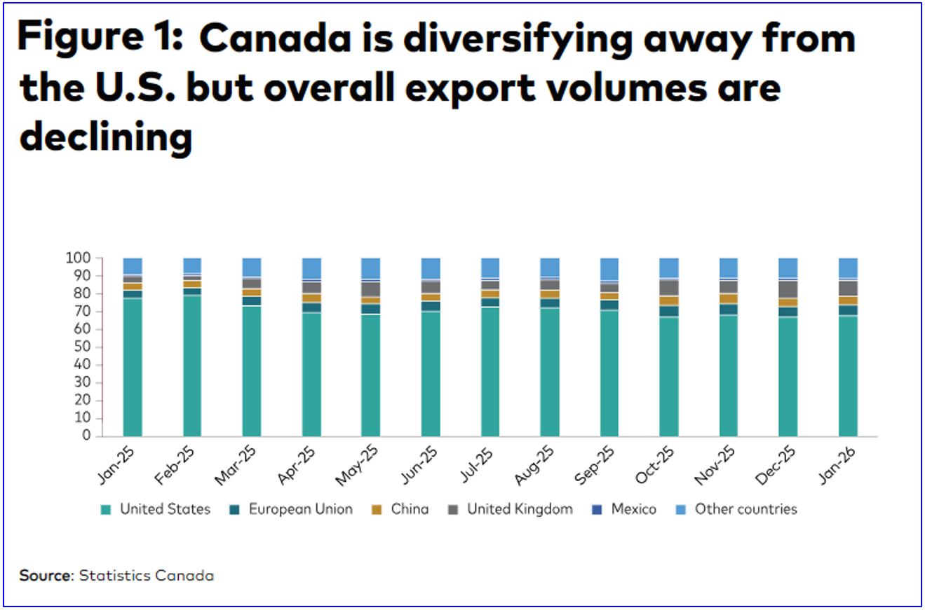 Although Canada made some progress diversifying its export exposure away from the United States as illustrated in Figure 1, with the U.S. share of exports declining to 68% in January 2026 from 76% in December 2024, the broader picture remains challenging. Total exports fell by approximately 10% over the same period, underscoring the difficulty of translating diversification efforts into aggregate export growth.