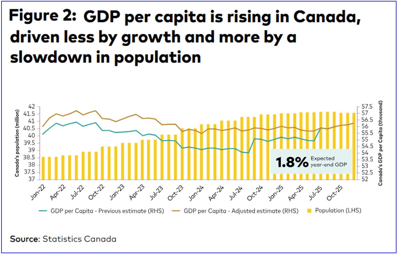 Canada’s GDP per capita has been rising in recent quarters, as illustrated in Figure 2. A key driver has been a marked slowdown in population growth, which appears to have turned negative on a net, semi-annual basis in the second half of 2025 by roughly 75,000, removing a significant drag on per-person output. Earlier in the cycle, rapid population gains consistently outpaced job creation and output growth, depressing GDP per capita even as headline GDP expanded. By mid-2025, population growth had effectively flattened, easing the arithmetic dilution of output and allowing GDP per capita to recover.