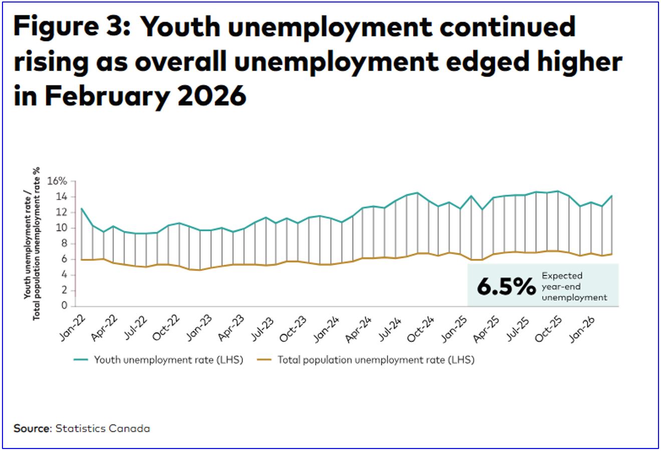 Average hours worked also fell sharply, to 31.1 in February from 32.9 in January. While the Labour Force Survey is inherently volatile and monthly readings should be interpreted with caution, the underlying trends are concerning. Consecutive job losses effectively erased most of the employment gains recorded in late 2025, with the bulk of the decline occurring in the private sector, reflecting cutbacks by firms facing weaker demand and rising cost pressures. In February, the unemployment rate rose to 6.7% from 6.5% (see Figure 3).