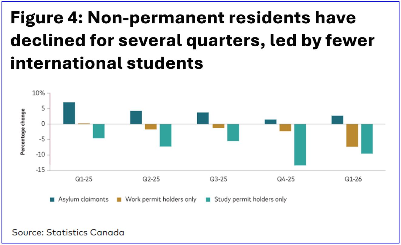 A defining feature of Canada’s current labour market is the abrupt slowdown in labour force growth. After several years of rapid population expansion, growth has stalled following a deliberate pullback in immigration and non‑permanent residents. Federal policy changes aimed at reducing the number of international students and temporary workers are now clearly visible in the data, as shown in Figure 4, with study permit holders declining across multiple recent quarters.